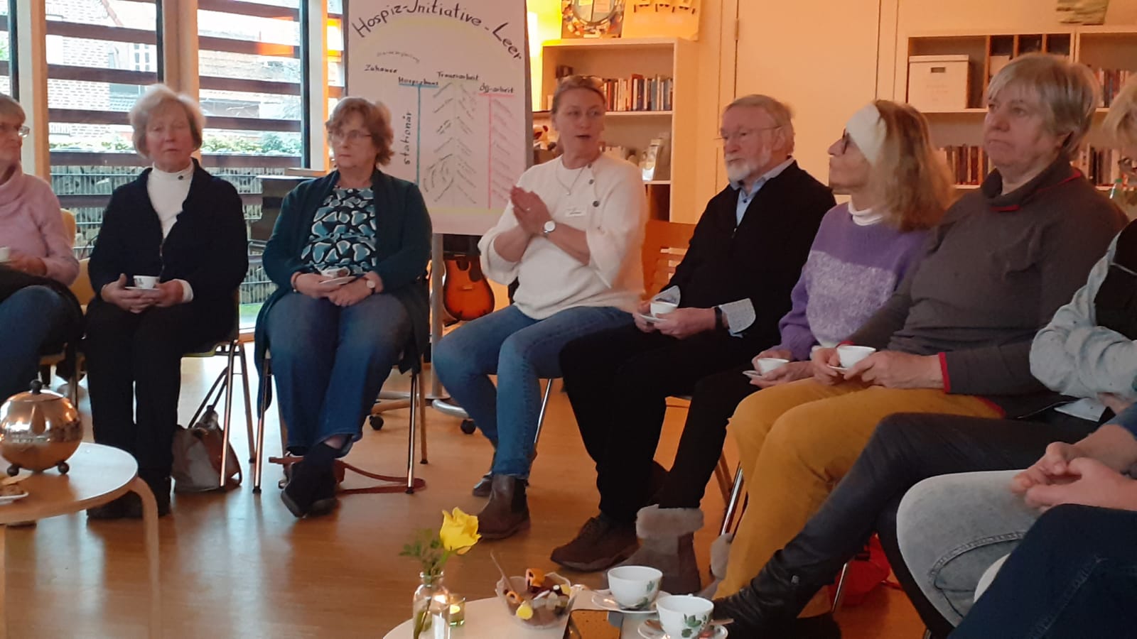 Trotzdem machten sich 28 interessierte Klüngeltüngels im Januar auf den Weg nach Leer, um sich über die Hospizinitiative im Allgemeinen und speziell die in Leer zu informieren. Sie wurden herzlich begrüßt von Frau Ute Fleßner, der Leiterin des Hospizhuus. Wie in Ostfriesland üblich, gab es zunächst (und auch zwischendurch) leckeren Tee mit Keksen.