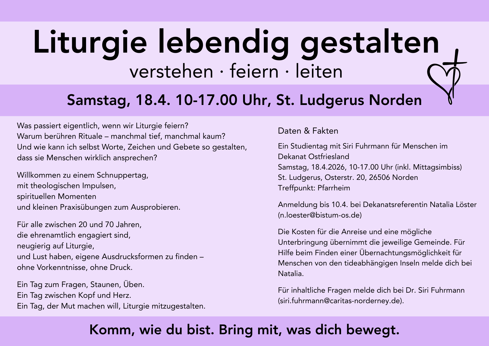 Am 18. April wird es von 10-17.00 Uhr in Norden einen kleinen Schnupperkurs unter dem Titel „Liturgie lebendig gestalten“ mit Siri Fuhrmann geben. Im Wissen darum, dass Liturgie auch hier im Dekanat weiterhin und zunehmend vielfältig und bunt sein wird, soll dieser Tag neugierigen Ehrenamtlichen die Möglichkeit bieten, sich ganz unverbindlich und in lockerer Umgebung mit diesem Thema auseinanderzusetzen.