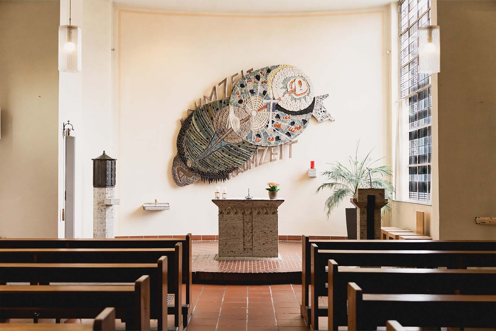 Der schlichte Kirchenraum wird dominiert von einem beeindruckenden Altarbild mit dem Titel „Raumzeit“, das 1975 von der Künstlerin Ruth Landmann aus Osnabrück geschaffen wurde. Das Werk ist inspiriert von dem Theologen und Naturwissenschaftler Teilhard de Chardin und stellt die Geschichte der Erde und der Menschheit unter dem Einfluss Gottes dar.
